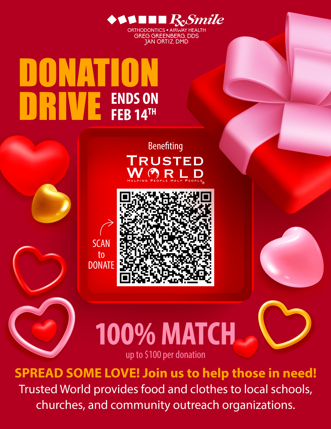 Start off the new year by making a difference in our greater Dallas communities. The RxSmile team is hosting a Valentine’s Day donation drive benefiting Trusted World. PLUS we are matching 100% of donations (up to $100 per donation). Patients (new, active, and in retention) can use the qr code or link below to donate. Then download/print your receipt and drop it off at the office, or email a copy to Mira at: mira_r@rxsmile.com. On Valentine’s Day, Dr. Greenberg will make one large matching donation to Trusted World!